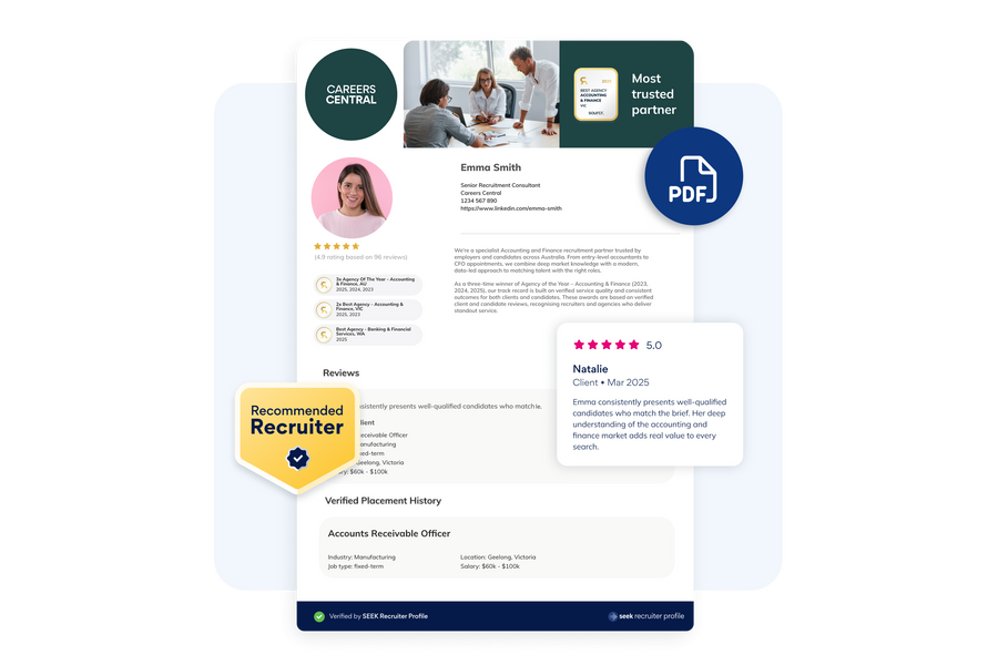 Your SEEK Recruiter Profile is a dedicated space to promote your reviews, star ratings, past placements, awards, and open roles.