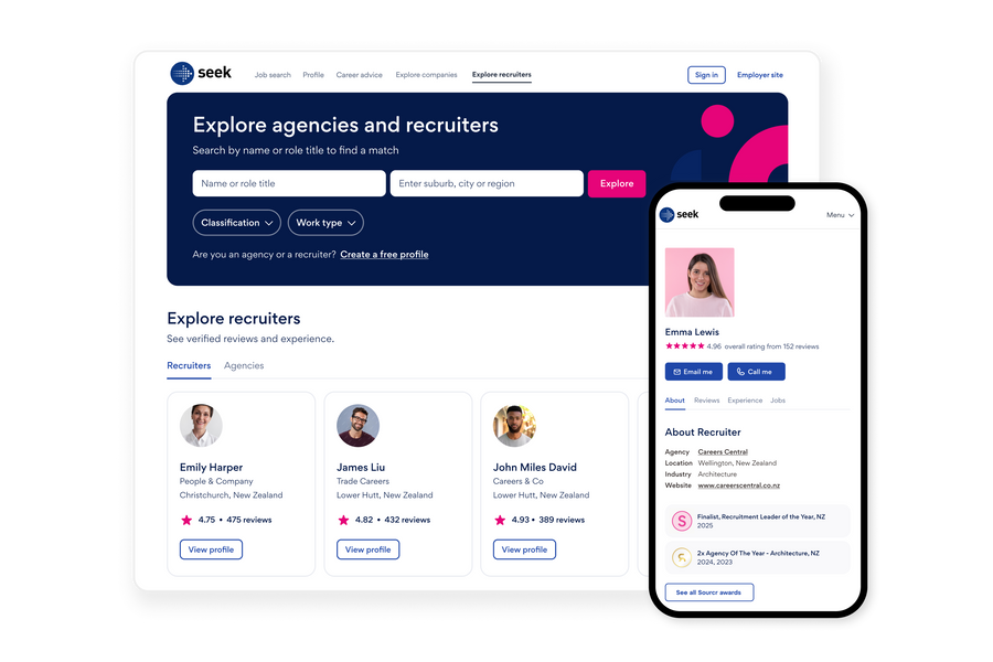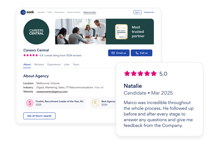 Your SEEK Recruiter Profile is a dedicated space to promote your reviews, star ratings, past placements, awards, and open roles.